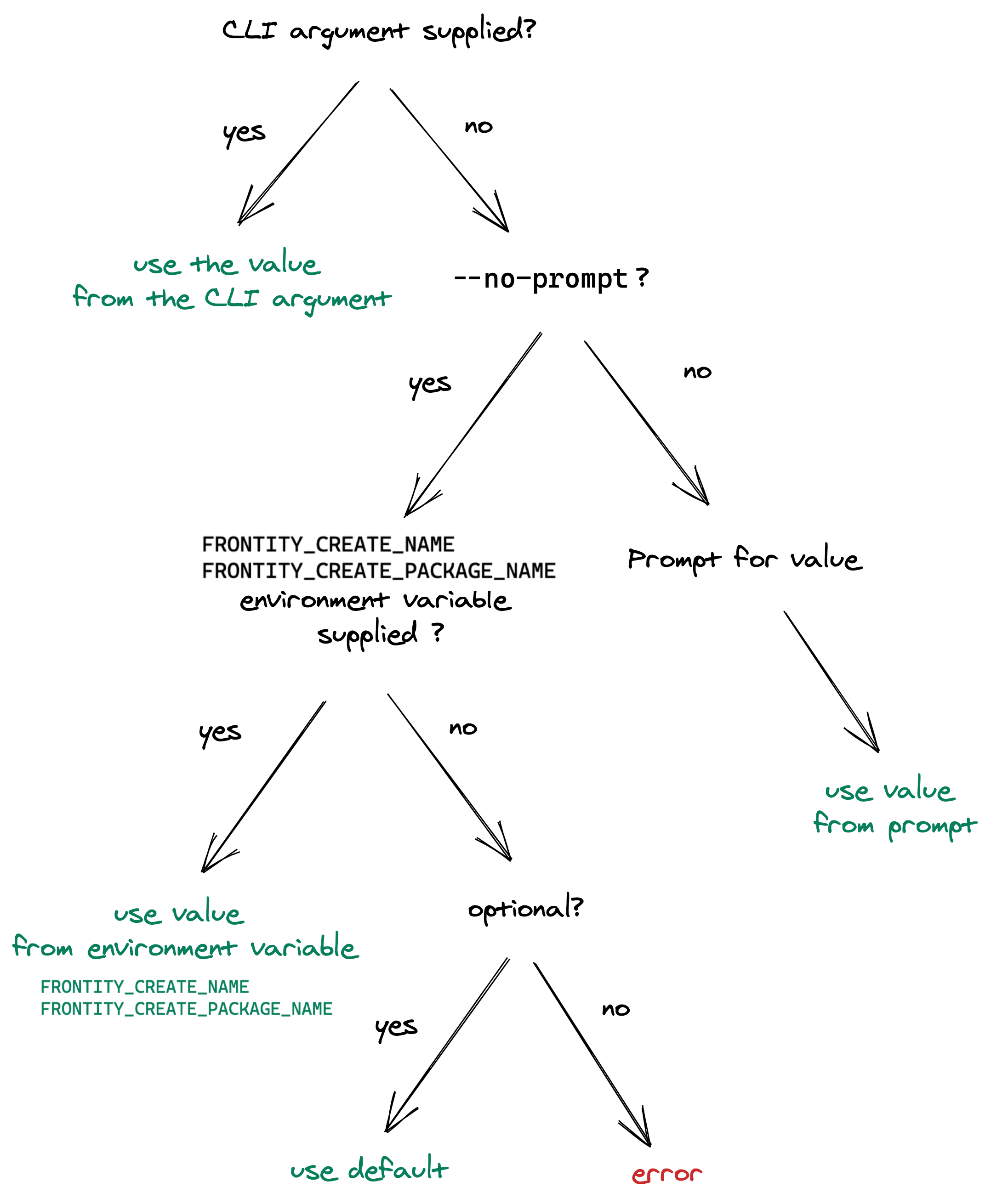 If you pass the --no-prompt flag to the create or create-package, the CLI will use the name from either FRONTITY_CREATE_NAME or FRONTITY_CREATE_PACKAGE_NAME environment variables.