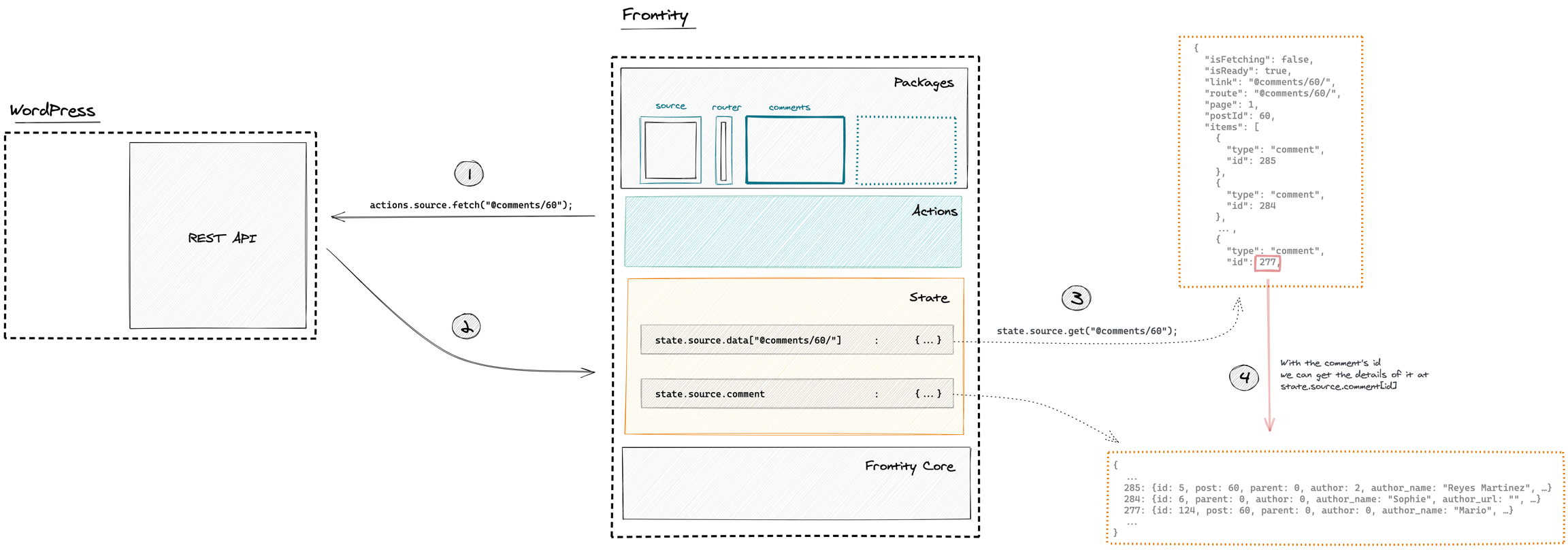 This data will be populated to the state so then we can do state.source.get("@comments/60") to get the ID's of these comments.