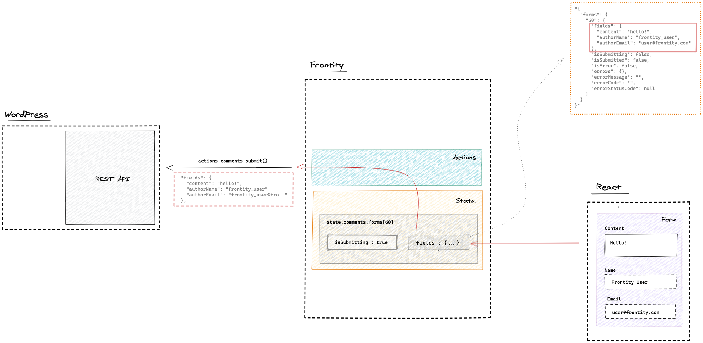 actions.comments.submit()This asynchronous action publishes a new comment for the post specified by postId. It submits the fields stored in the respective form (i.e. state.comments.forms[postId]) or the fields passed as a second argument. If fields are passed, those replace the current values stored in state.comments.forms[postId].fields.