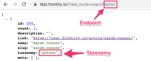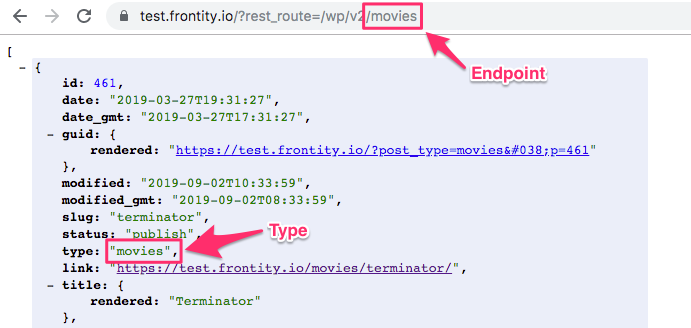 Note that in this case taxonomyand endpointare different. In the next example, we will fetch CPT "movies" instead of "posts", and add some params. It would be something like this: